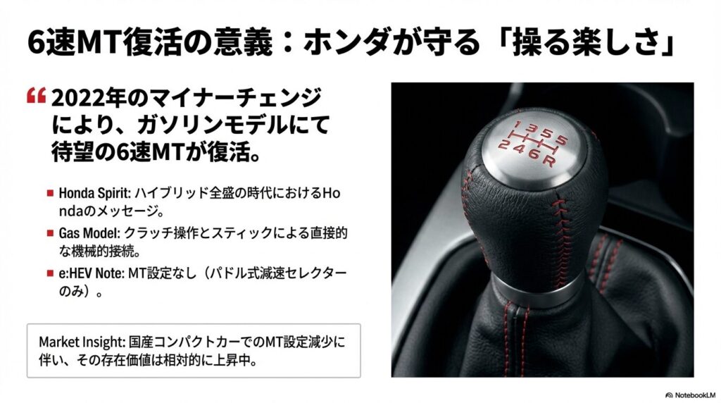 「新型フィットRSにMTはあるのか?」これは、車好きにとって最大の関心事の一つでした。結論から言うと、2022年のマイナーチェンジでガソリンモデルに6速MTが見事に復活しました。先代モデルではハイブリッドのスポーティーグレードが存在したものの、MTの設定はなく、多くのファンがその復活を待ち望んでいました。このMT復活は、ホンダが依然として「操る楽しさ」を大切にしていることの証と言えるでしょう。特に近年の国産コンパクトカー市場ではMTの設定が減少傾向にあるため、フィットRSのMTモデルは非常に貴重な存在です。