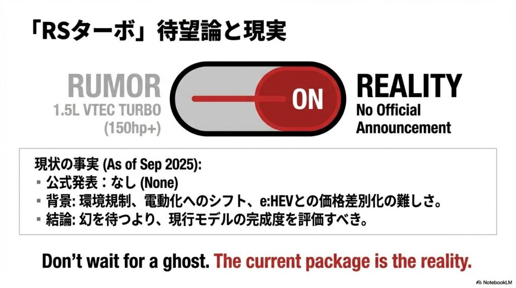 これはあくまでファンの間での期待や噂の段階です。背景には、厳しい燃費基準や電動化へのシフトといった自動車業界全体の流れがあります。ターボ化による価格の上昇や、ハイブリッドのe:HEVモデルとの差別化が難しいといった課題も考えられます。とはいえ、将来的な特別仕様車や次期モデルでの登場を期待する声は後を絶ちません。幻のRSターボ、その登場を多くのファンが待ち望んでいます。