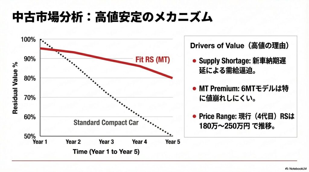 また、世界的な半導体不足や原材料価格の高騰により、新車の価格自体が上昇傾向にあります。新車価格が上がれば、それに応じて中古車相場も引き上げられるのが一般的です。フィットRSも例外ではなく、今後のマイナーチェンジなどで新車価格が改定されれば、現行モデルの中古車価格も追随して値上がりする可能性があります。もちろん、景気の動向や新たな競合車種の登場など、価格を下げる要因も存在しますが、長期的に見れば、走りの楽しさを提供してくれるフィットRS MTモデルの資産価値は、維持されやすい、あるいは上昇する可能性を十分に秘めていると言えるでしょう。