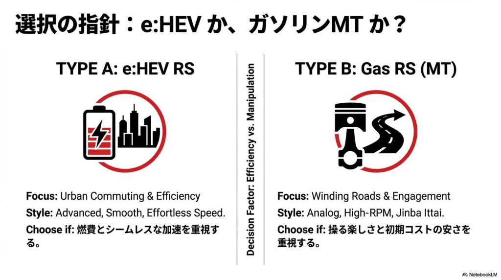 • e:HEVかガソリンMTか、自分のスタイルに合っているか