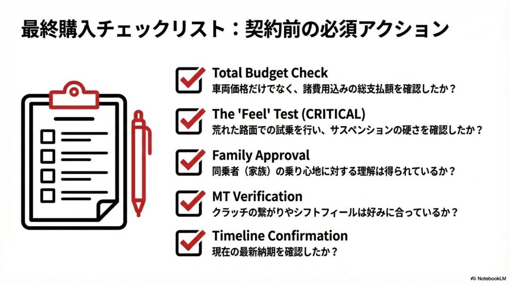 そして、最も大切なのは試乗で得た感覚です。カタログスペックやレビューだけではわからない、実際の運転フィール、シートの座り心地、視界の広さなど、ご自身がどう感じたかを信じましょう。特にMTモデルを検討している方は、クラッチの繋がりやシフトフィールの確認は必須です。これらの最終チェックを経て、心から「この車が欲しい」と思えたなら、きっと素晴らしいカーライフが待っているはずです。FIT RS MT新型は、実用性と運転の楽しさを高い次元で両立させた、現代において希少な一台です。