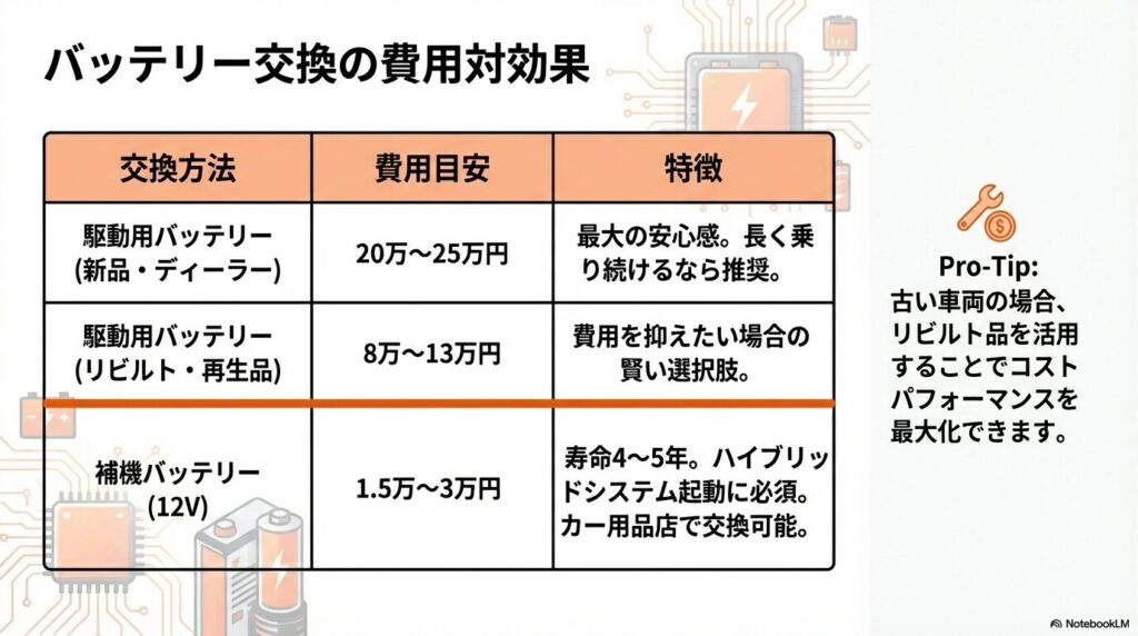 特に駆動用バッテリーの交換費用は高額であり、新品交換では20万円以上、リビルド品でも10万円前後かかります。そのため、予算や車両の今後の使用年数を加味して判断することが重要です。