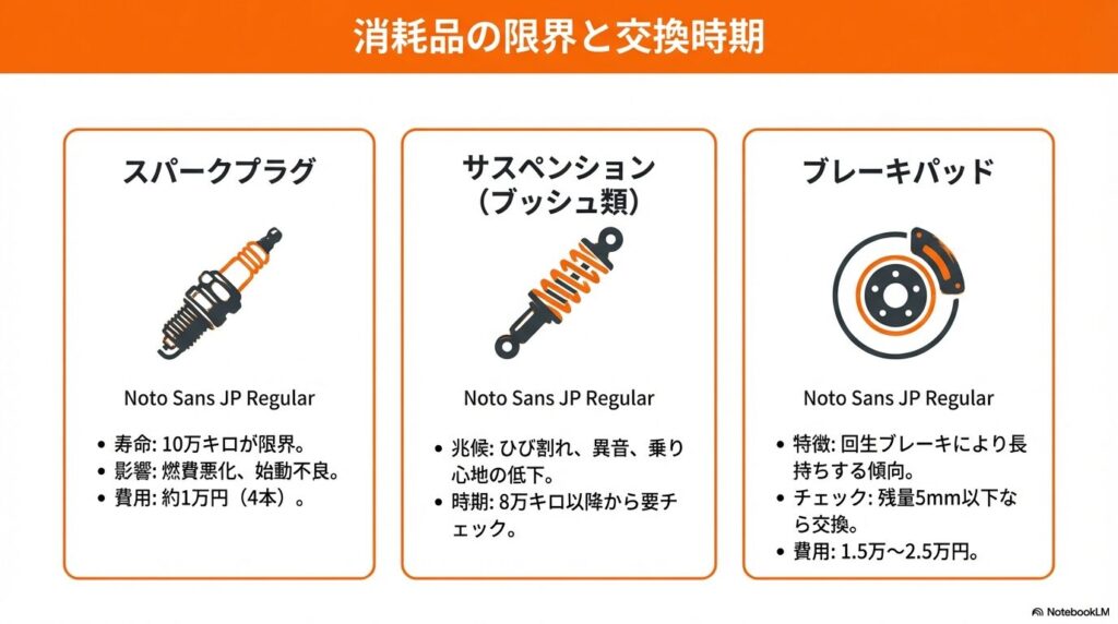 ただし、安心して乗り続けるためには、走行距離10万キロを一つの節目として交換部品のチェックを行うことが重要です。特にバッテリーや足回りのゴム部品、ブレーキパッドなどは劣化の兆候が見られやすくなります。