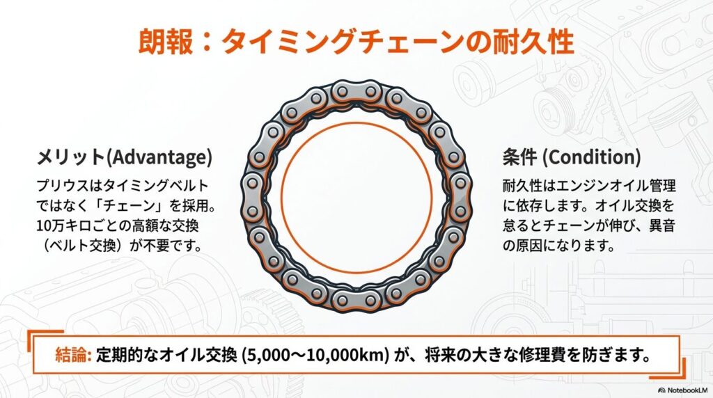 プリウスにはタイミングベルトではなくタイミングチェーンが採用されています。この違いは、メンテナンスコストに大きく関わってきます。