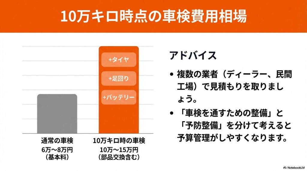 10万キロ走行時の車検では、通常の法定整備に加え、劣化部品の交換費用が加算されるケースが多いため、車検費用が高くなる傾向があります。