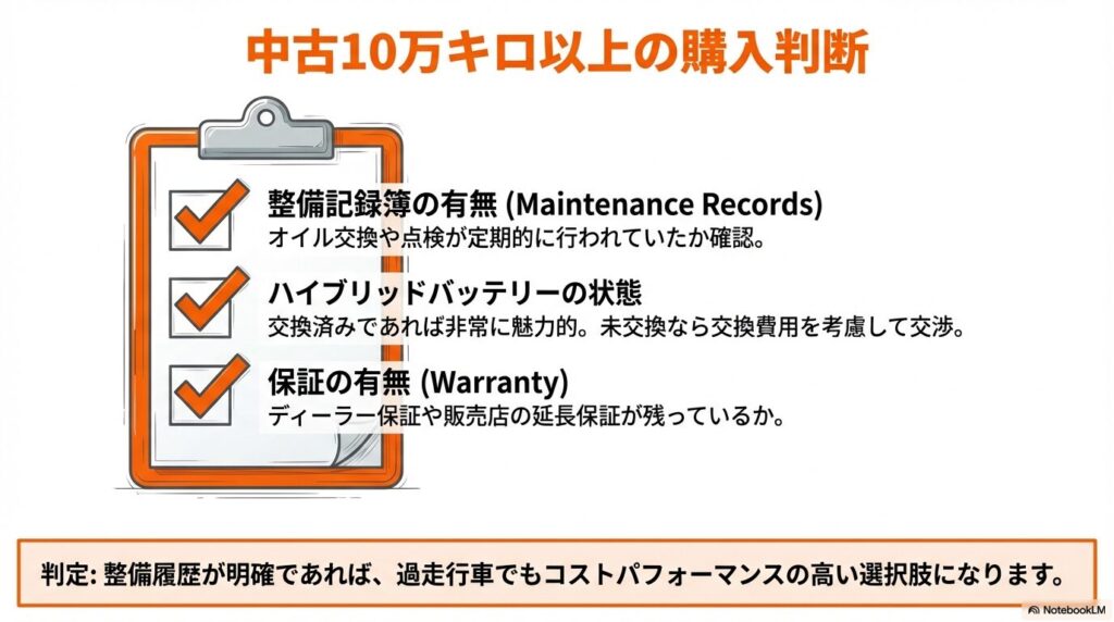 • 中古で10万キロ以上の車両は整備記録とバッテリー状態を重視