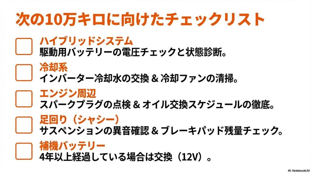 以下は、10万キロ時点で点検・交換をおすすめする部品と、その理由をまとめた一覧です。