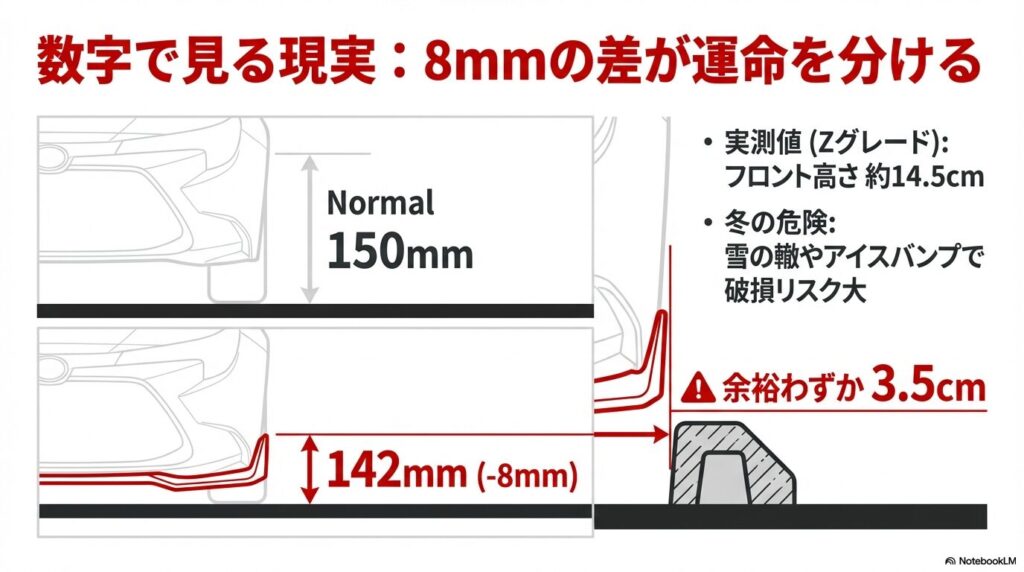 まず、ノーマルのプリウス60系の最低地上高は150mmですが、モデリスタのフロントスポイラーを装着すると、約8mmダウンして142mmになります。また、実地検証では、エアロ付きのZグレードでフロント高さが14.5cmとなり、タイヤ止めまでの余裕はわずか3.5cm程度と報告されています。