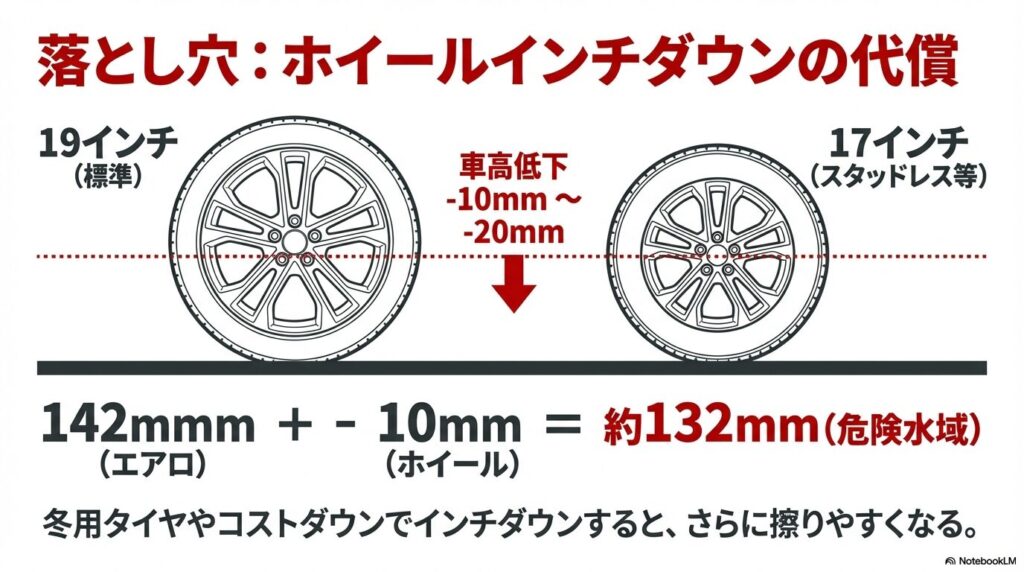 実際には、ホイールのインチ数だけでなく、タイヤの扁平率や外径サイズも影響しますが、19インチから17インチに変更すると、約10~20mm程度最低地上高が低くなるケースもあります。これにより、縁石や道路の段差、タイヤ止めへの接触リスクが高まります。