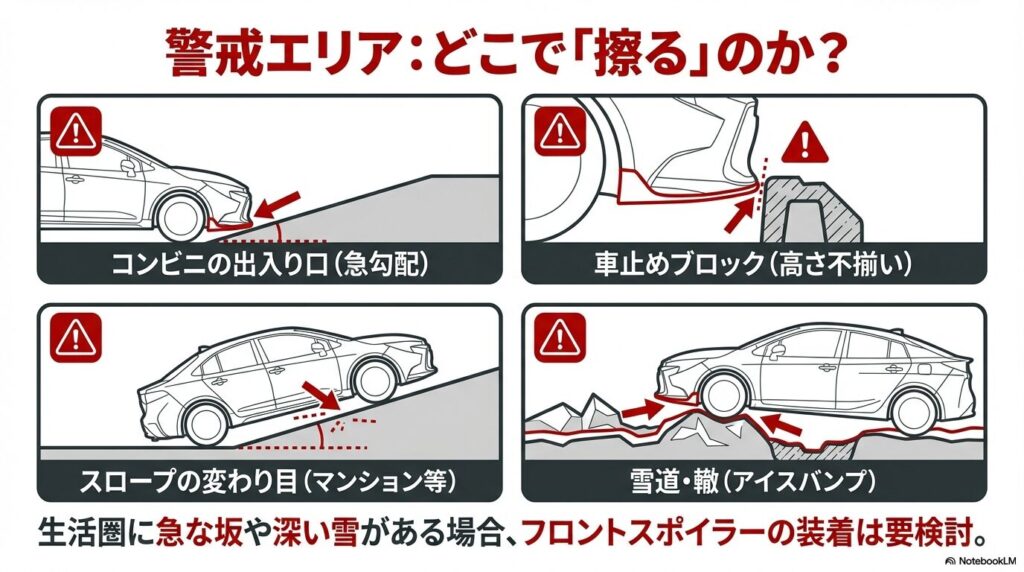 - 特にフロントスポイラーは段差や車止めで接触しやすい