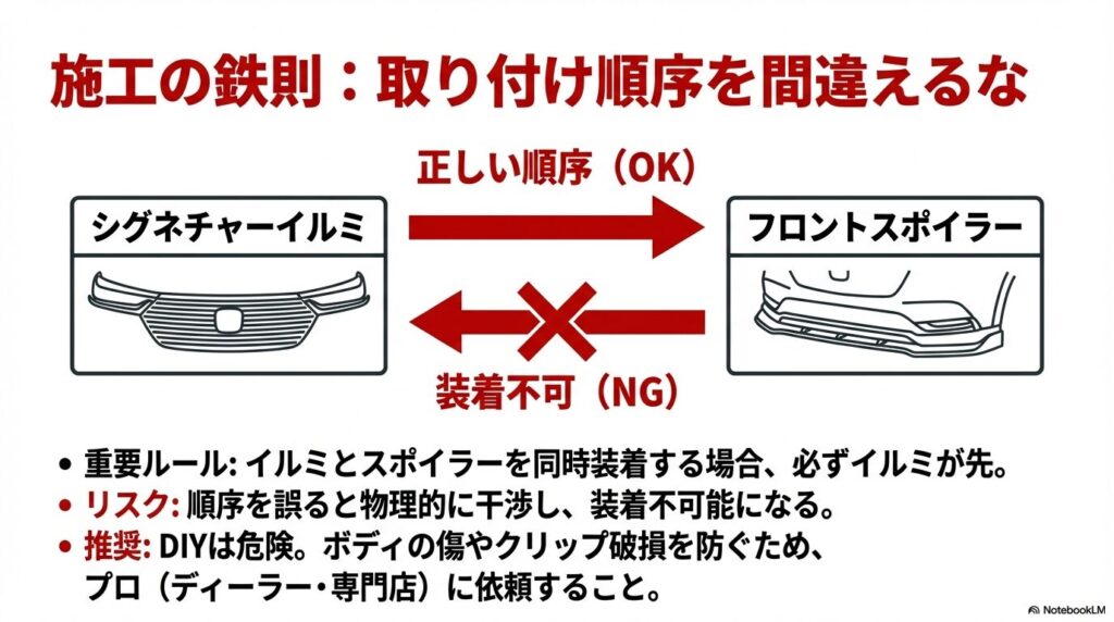 | シグネチャーイルミ+フロントスポイラー | ①シグネチャーイルミ → ②スポイラー | 干渉してスポイラーが取り付け不可 | 施工前に順序確認・専門店での取付け |