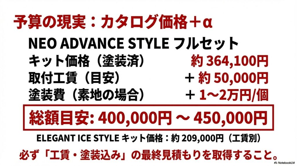 | 合計費用例 | セット価格+工賃+塗装=約40~45万円 | 施工前に見積もり確認が必要 |