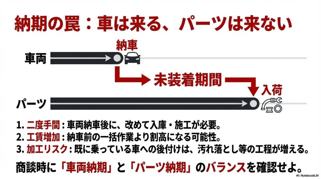 納期が遅れると、車体だけ先に納車され、後日パーツのみ追加装着となるため、2度の手間と工賃がかかる可能性があります。また、一度納車された車両にパーツを装着する場合、車体に追加加工が必要になるケースもあり、その際の作業費や預かり期間が長引くことも想定されます。