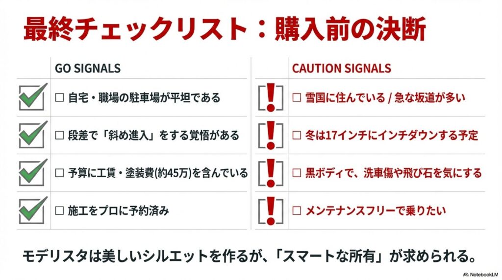 このため、モデリスタのエアロを選ぶ場合は、自宅や職場の駐車環境、日常的な走行ルート、冬場の気象条件をよく確認し、実用性とデザイン性のバランスを考えることが大切です。