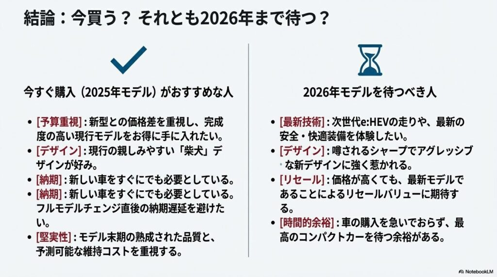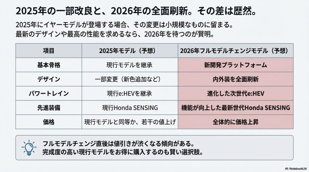 一方、2026年に予想されるフルモデルチェンジでは、これまで述べてきたように、デザイン、プラットフォーム、パワートレイン、先進装備のすべてが刷新されます。つまり、2025年モデルと2026年モデルとでは、全く別の車と言えるほど大きな違いがあります。最新のデザインや最高の性能を求めるのであれば、2026年のフルモデルチェンジを待つのが賢明です。しかし、