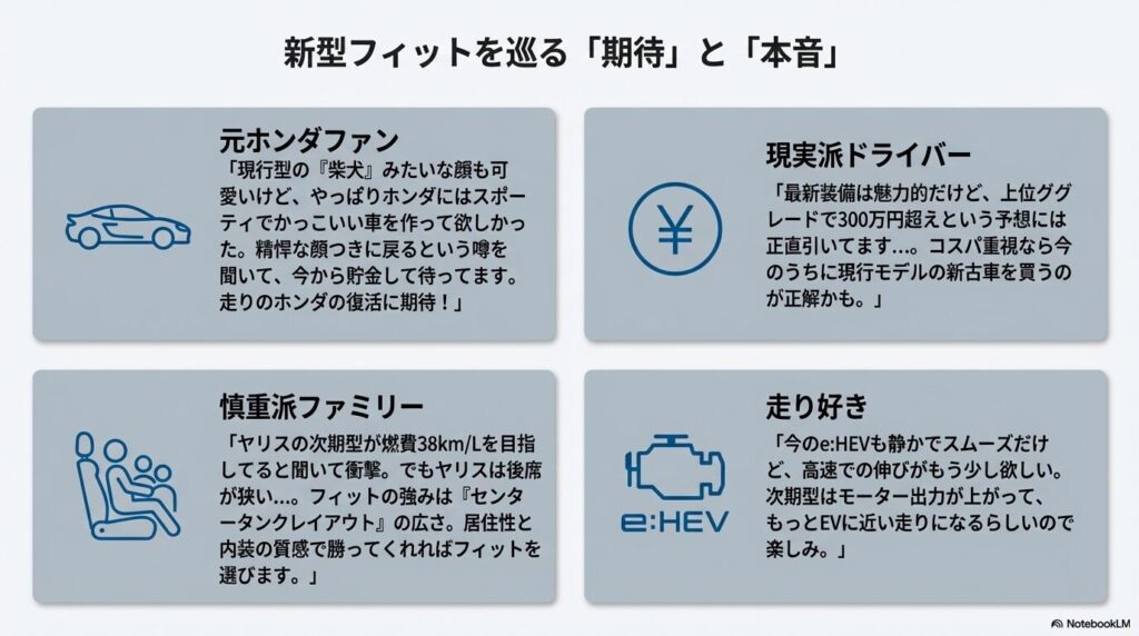 💬 ライバルの進化と天秤にかける慎重派 「ヤリスの次期型が燃費38km/Lを目指してるって聞いて衝撃。でもヤリスは後席が狭いんですよね…。フィットの強みはやっぱり『センタータンクレイアウト』の広さ。燃費で負けても、居住性と内装の質感で勝ってくれれば、家族持ちの僕はフィットを選びます。」