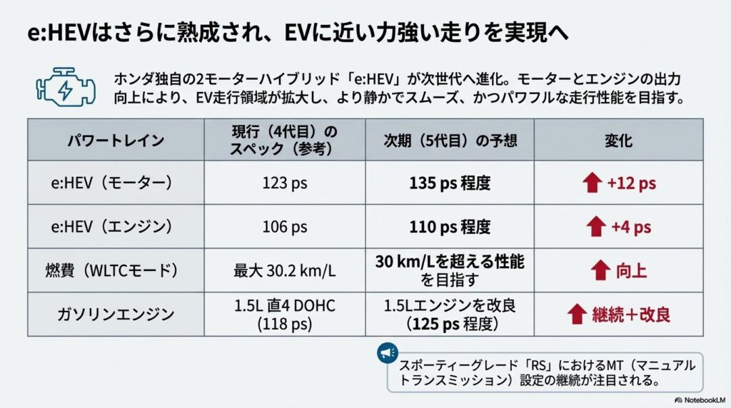 パワートレインのモデルチェンジも、次期フィット5の大きな注目点です。中心となるのは、ホンダ独自の2モーターハイブリッドシステム「e:HEV」のさらなる進化です。現行システムでも高い評価を得ていますが、次期モデルではモーターとエンジンの両方の出力が向上し、より力強く、静かで、スムーズな走行性能を実現すると予想されています。モーターの出力を高めることで、EV走行領域が拡大し、市街地での燃費性能はさらに向上するでしょう。WLTCモード燃費でリッターあたり30kmを超える性能も十分に考えられます。