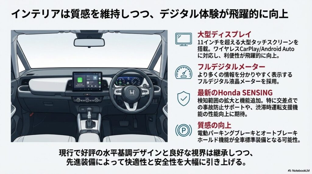 インテリアと先進装備も、フルモデルチェンジによって大幅な進化が期待される分野です。次期フィット5のインテリアでは、現行モデルで好評の水平基調デザインと良好な視界は継承しつつ、デジタル体験の質が大きく向上すると予想されています。インフォテインメントシステムには、11インチを超える大型のタッチスクリーンディスプレイが搭載され、クラウドとの連携やワイヤレスでのスマートフォン接続(Apple CarPlay/Android Auto)に対応する可能性があります。これにより、ナビゲーションやエンターテインメント機能の利便性が飛躍的に高まるでしょう。