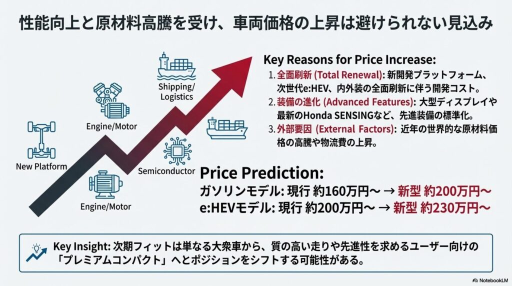 フルモデルチェンジで最も気になるのが、新型フィットの価格です。結論から言うと、現行モデルよりも価格は上昇すると予想するのが妥当でしょう。その理由は、プラットフォームの刷新やパワートレインの進化、先進安全装備の性能向上など、多岐にわたる改良が施されるためです。また、近年の世界的な原材料価格の高騰や物流費の上昇も、車両価格を押し上げる要因となります。