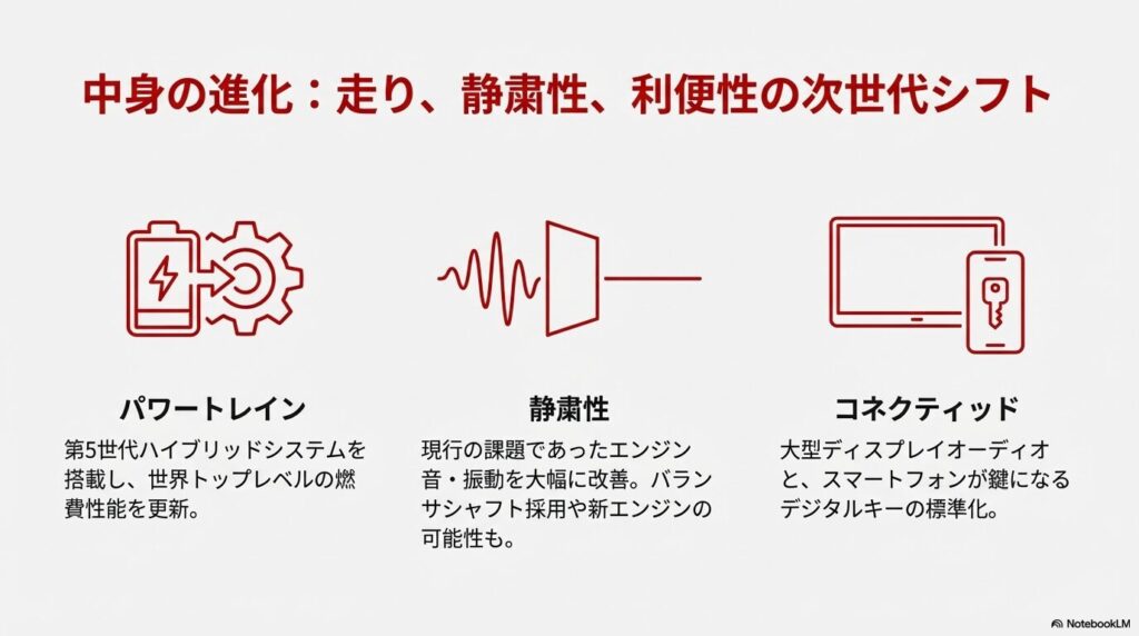 まず、プラットフォームは現行の「GA-B」を改良したものが継続採用される見込みです。これにより、軽量かつ高剛性なボディはさらに磨きがかかります。また、パワートレインには第5世代のハイブリッドシステムが搭載され、世界トップレベルの燃費性能を更新すると見られています。