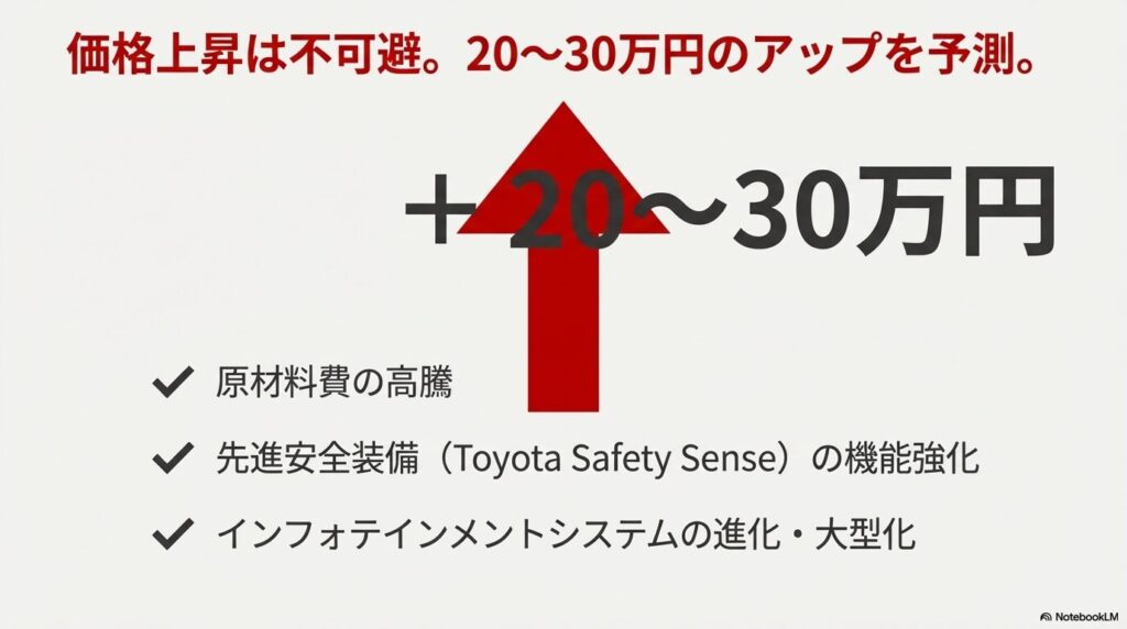 残念ながら、フルモデルチェンジに伴う車両価格の上昇は避けられない情勢です。原材料費の高騰や、先進安全装備(Toyota Safety Sense)の機能強化、インフォテインメントシステムの大型化などがコスト増の要因となります。