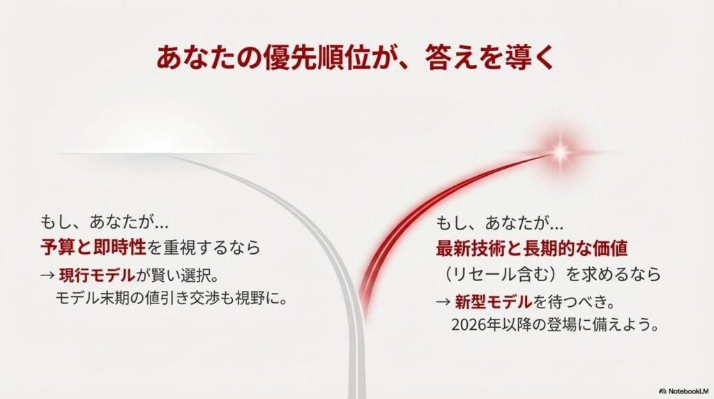 現行モデルを買うか、新型を待つかは悩ましい問題です。現行モデルは熟成されており、初期不良のリスクが少なく、納期も比較的安定しています。何より価格が現行水準で手に入ることが魅力です。