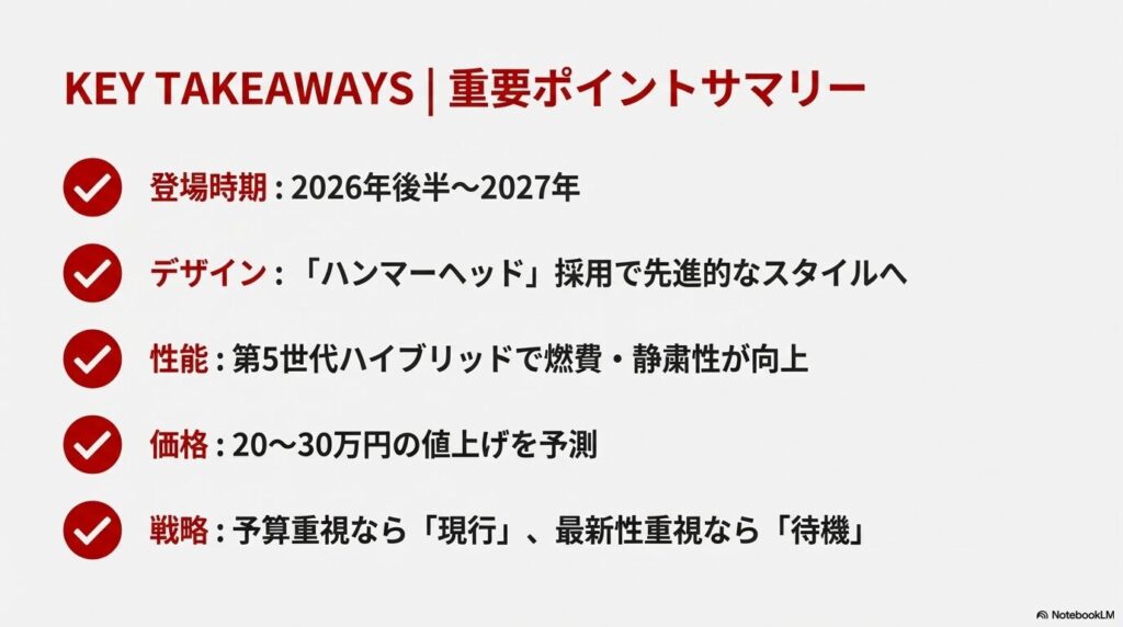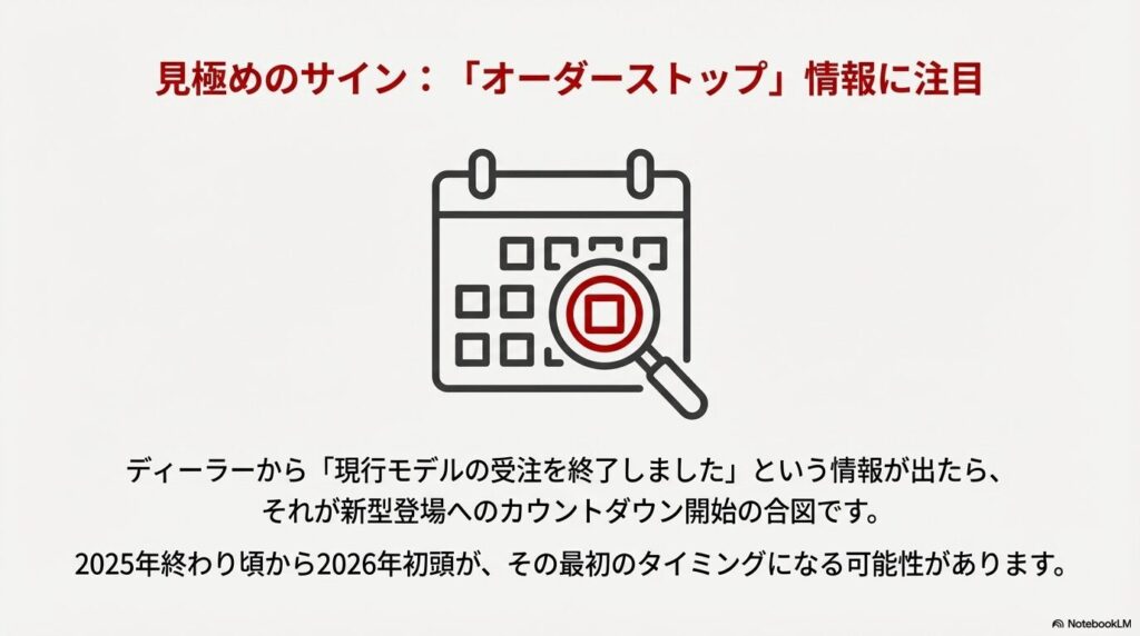 もし2026年の発売であれば、2025年の終わり頃から2026年初頭にかけて現行モデルの受注調整が始まる可能性があります。「現行型の注文ができなくなった」というニュースが出たら、新型登場のカウントダウンが始まった合図です。